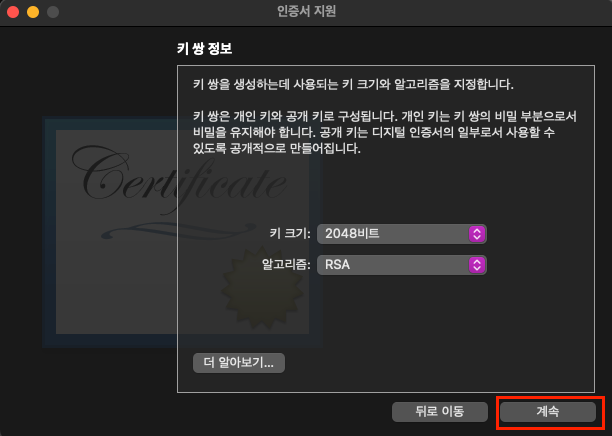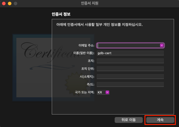 위에서 '인증서 생성...' 을 누르면 아래의 창이 뜰 것입니다.