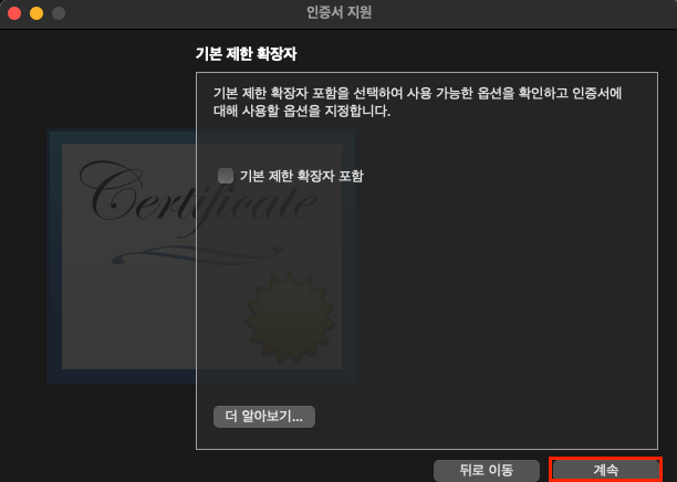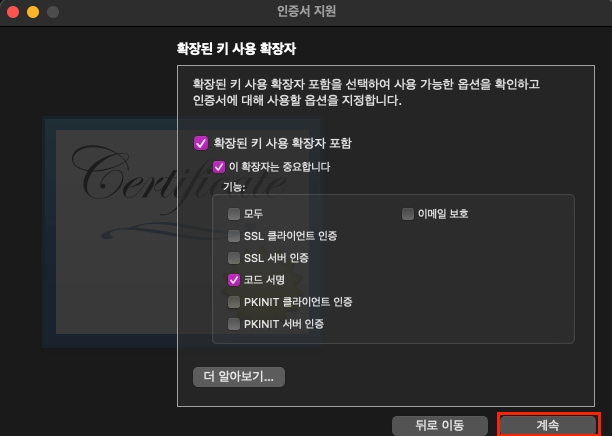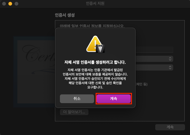 메뉴바 -> 키체인 접근 -> 인증서 지원 -> 인증서 생성...