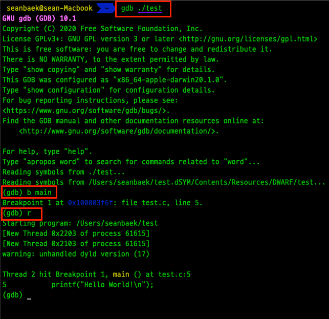 아래는 실제로 Hello World! 를 출력해주는 .c 파일을 GDB로 디버깅해보는 사진입니다.