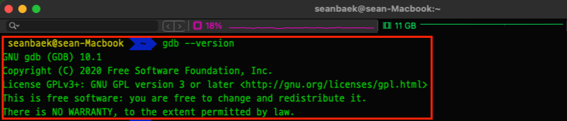 만약 자신의 MacOS에 GDB를 설치한 적 있다면 아래의 사진과 같이 gdb --version을 입력하여 설치 여부를 확인해 줍니다.