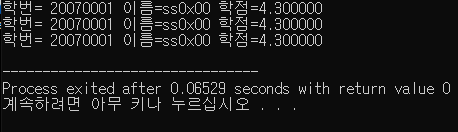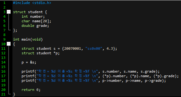 16 ~ 18번째 줄 : 일단 16번째 줄에서 구조체 변수 s의 멤버들을 참조해서 출력한다.
