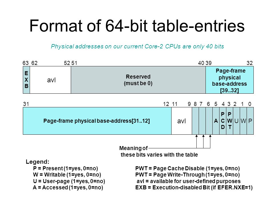 상위 4byte(bit 32 ~ bit 63)는 기준 주소 필드(bit 32 ~ bit 39), 예약된 영역(bit 40 ~ bit 51), 임의로 사용 가능한 영역(bit 52 ~ bit 62), EXB(bit 63)로 구성되어 있습니다.