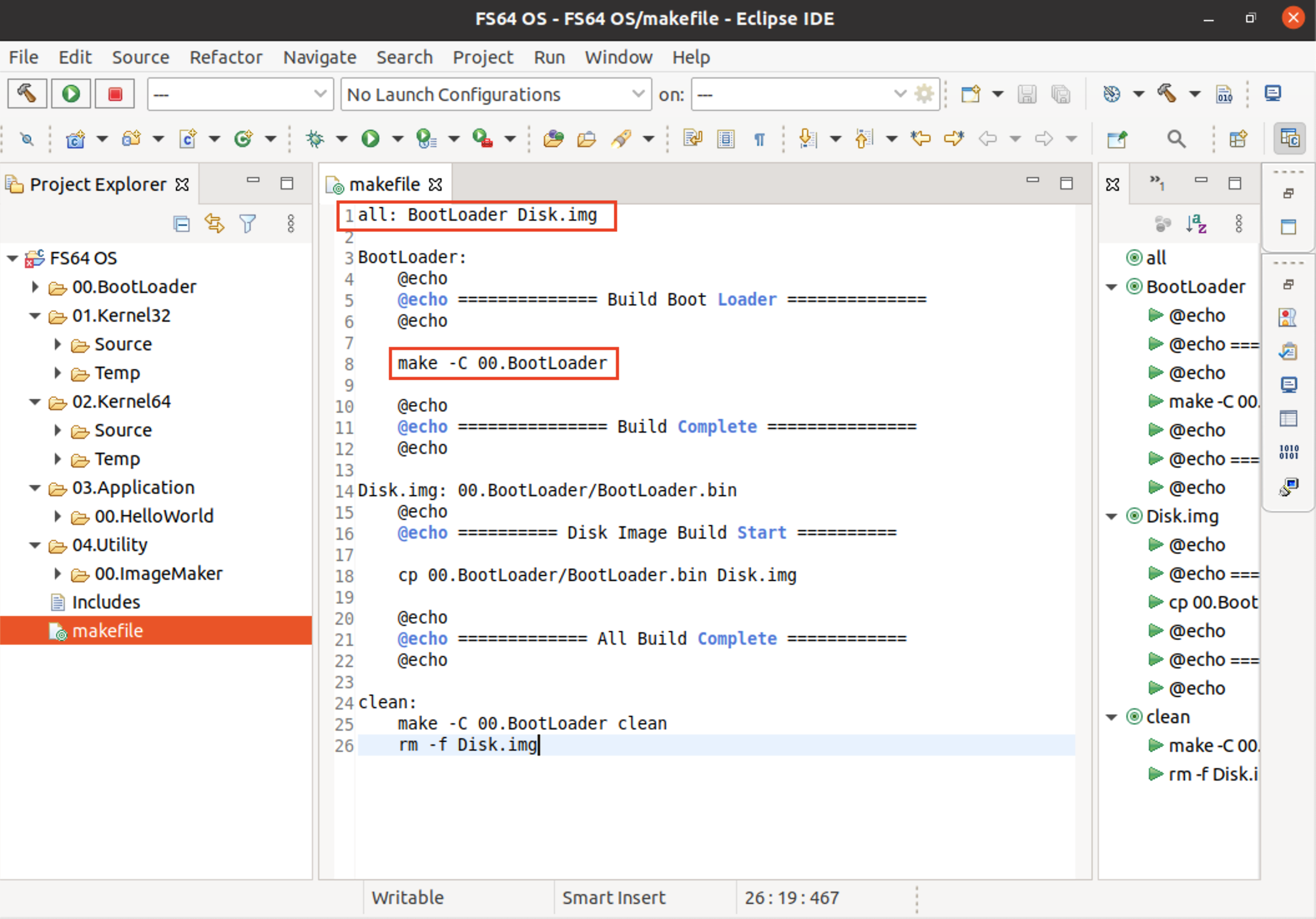 가장 위에 있는 all: BootLoader Disk.img 이라고 되어 있는 Target은 make를 실행하면서 옵션으로 Target을 직접 명시하지 않았을 때 기본적으로 사용하는 Target입니다.