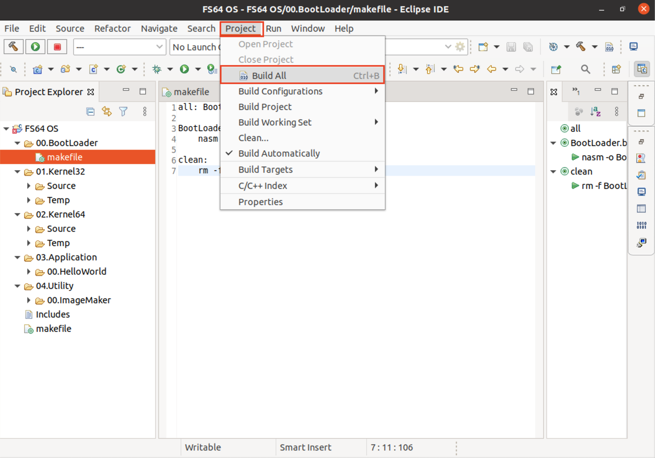 이렇게 두 개의 makefile을 만들었다면 아래의 사진처럼 Eclipse의 상단 메뉴에서 Proejct -> Build All(Ctrl+B)을 클릭하거나