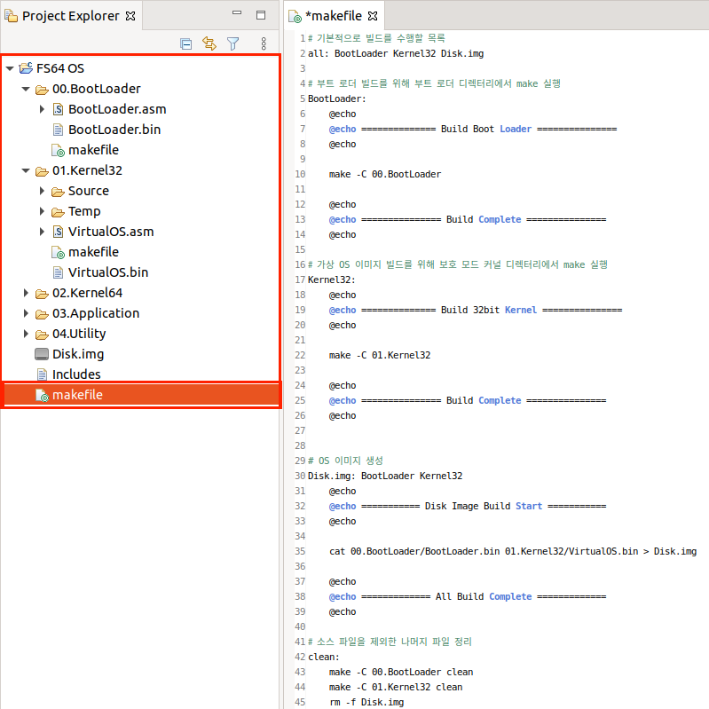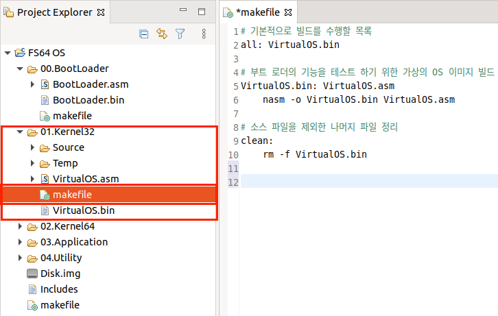 이미 생성되어 있는 FS64 OS 디렉터리의 makefile에 가상 OS에 관련된 부분만 추가하여 테스트 합니다.