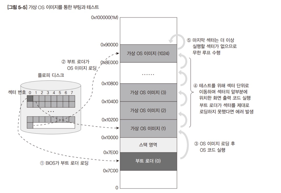 가상 OS 이미지는 자신의 섹터 번호를 화면 위치에 대응시켜서 0 ~ 9까지 번호를 출력한다면 화면에 출력된 문자의 위치와 수를 확인하여 정상여부를 판단할 수 있습니다.