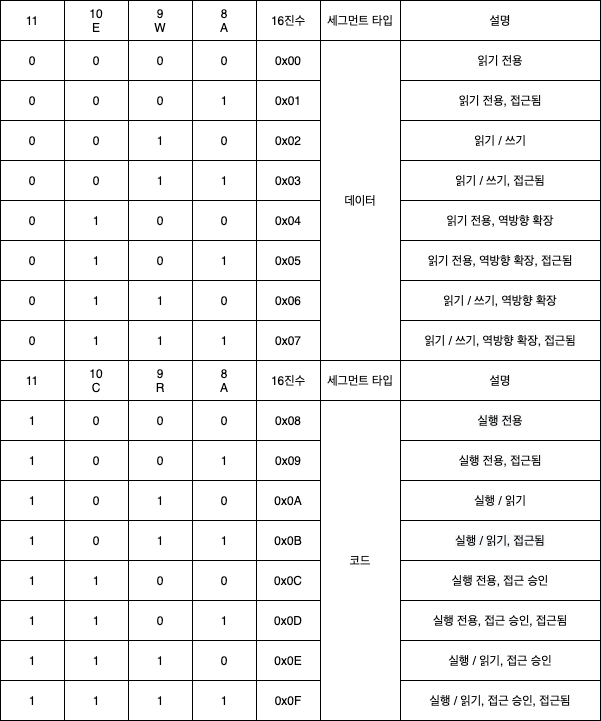 아래의 표를 참고하면, 코드 세그먼트 타입은 0x0A(Execute/Read) 데이터 세그먼트 타입은 0x02(Read/Write)가 됩니다.