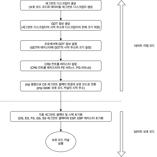 리얼 모드에서 보호 모드로 전환하려면 크게 6단계를 거쳐야 하는데 그중 상위 2 단계는 보호 모드 전환에 필요한 자료구조를 생성하는 단계이고, 나머지 4단계는 생성된 자료구조를 프로세서에 설정하는 단계입니다.