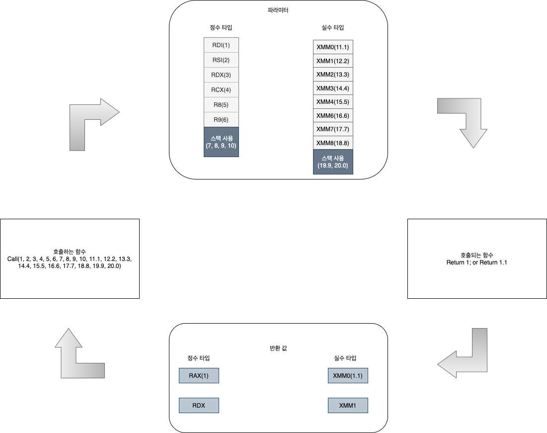 반환 값으로 RAX, RDX 레지스터와 XMM0, XMM1 레지스터를 사용하게 되어 있지만, 일반적으로 RAX 레지스터와 XMM0 레지스터를 사용합니다.