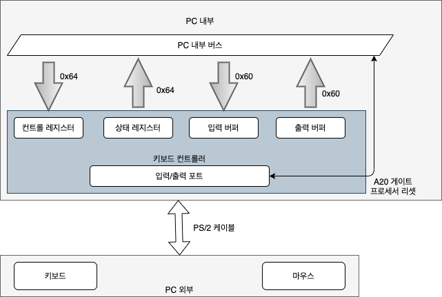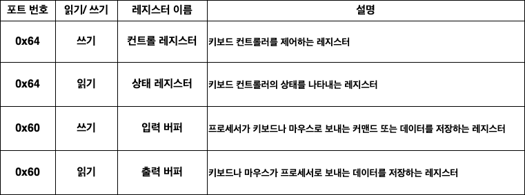 키보드 컨트롤러는 PC 내부 버스(BUS)와 포트 I/O 방식으로 연결되어 있으며, 포트 주소는 0x60과 0x64를 사용합니다.