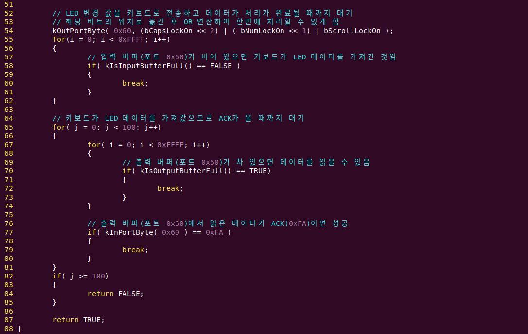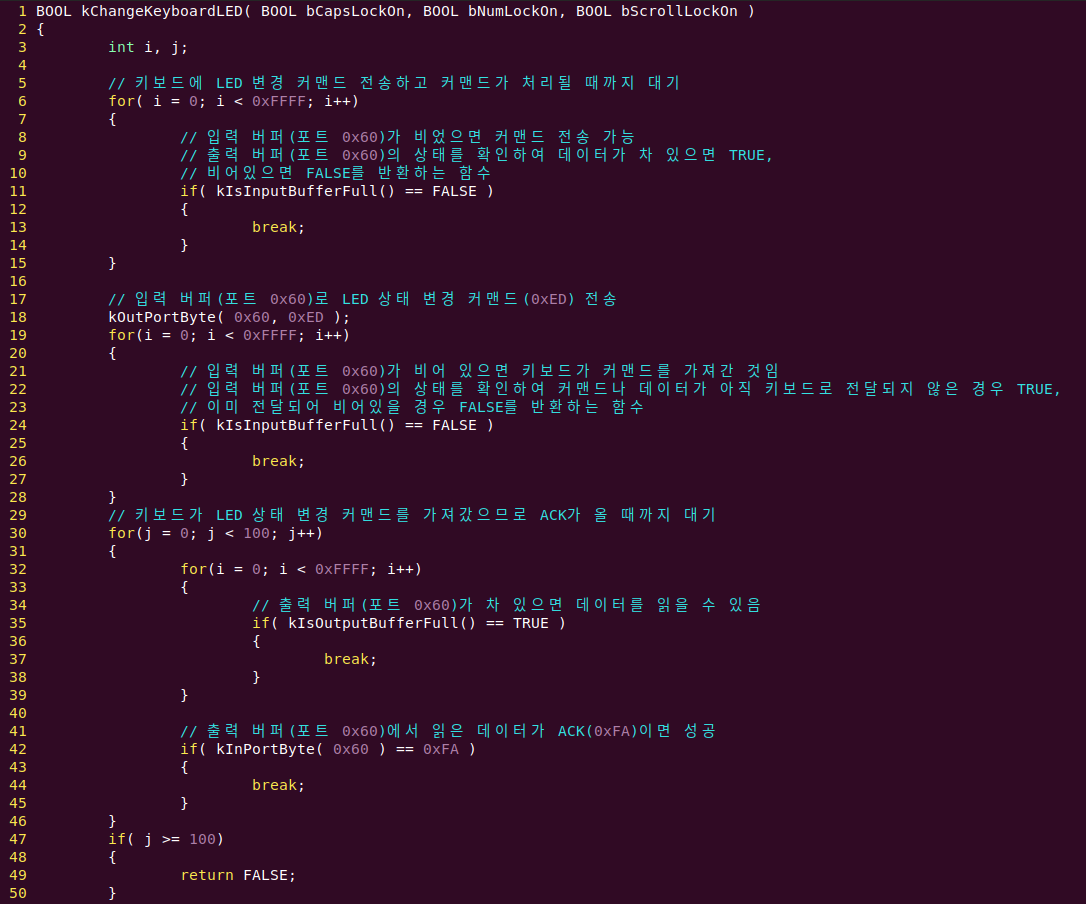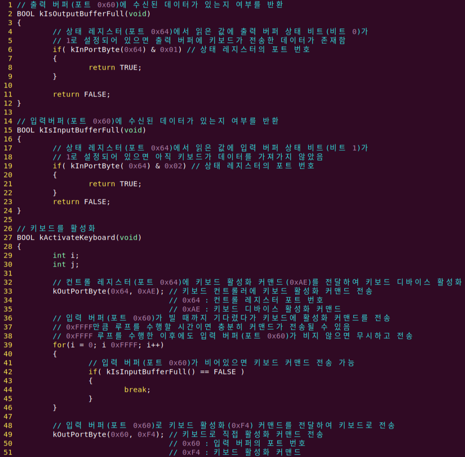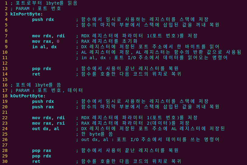 위 코드에서 사용한 kOutPortByte(), kInPortByte() 함수는 어셈블리어의 OUT 명령어와 IN 명령어를 수행하는 어셈블리어 함수입니다.