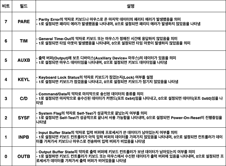 커맨드를 처리하는 시간은 키보드와 키보드 컨트롤러의 상태에 따라 가변적인 부분이므로 키보드 컨트롤러의 상태를 확인할 수 있어야 하는데, 이때 사용하는 것이 키보드 컨트롤러의 상태 레지스터(포트 0x64)입니다.