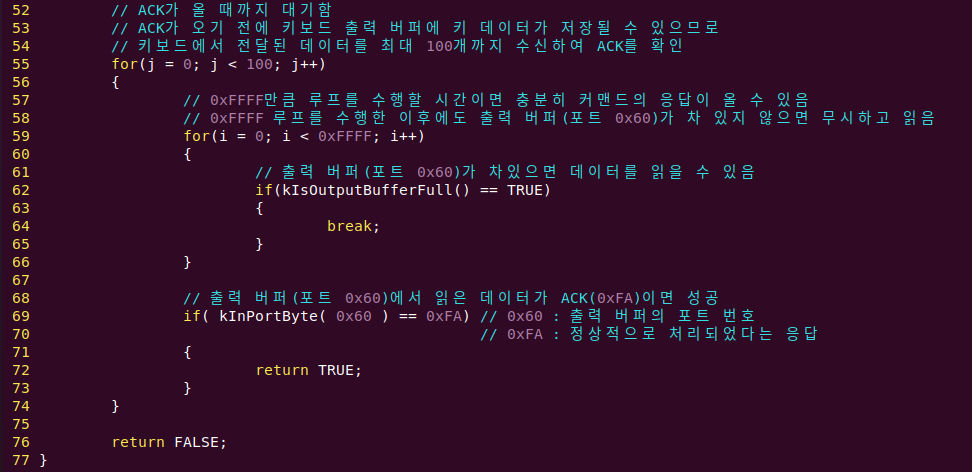키보드는 커맨드를 성공적으로 처리했을 때 ACK(0xFA)를 전송하는데, 이때 ACK가 전달되기 전에 몇몇 키 값이 이미 출력 버퍼에 들어 있을 수 있기 때문에 출력 버퍼를 계속 읽어 뒤쪽에 삽입된 ACK(0xFA)를 찾아야 합니다.
