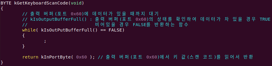 사실 키보드 컨트롤러로부터 키 값을 얻는 것이 목적이라면 상태 레지스터(포트 0x64)를 읽어서 OUTB 비트가 1인지 검사하고 나서 출력 버퍼 레지스터(포트 0x60)를 읽는 것만으로 충분하지만