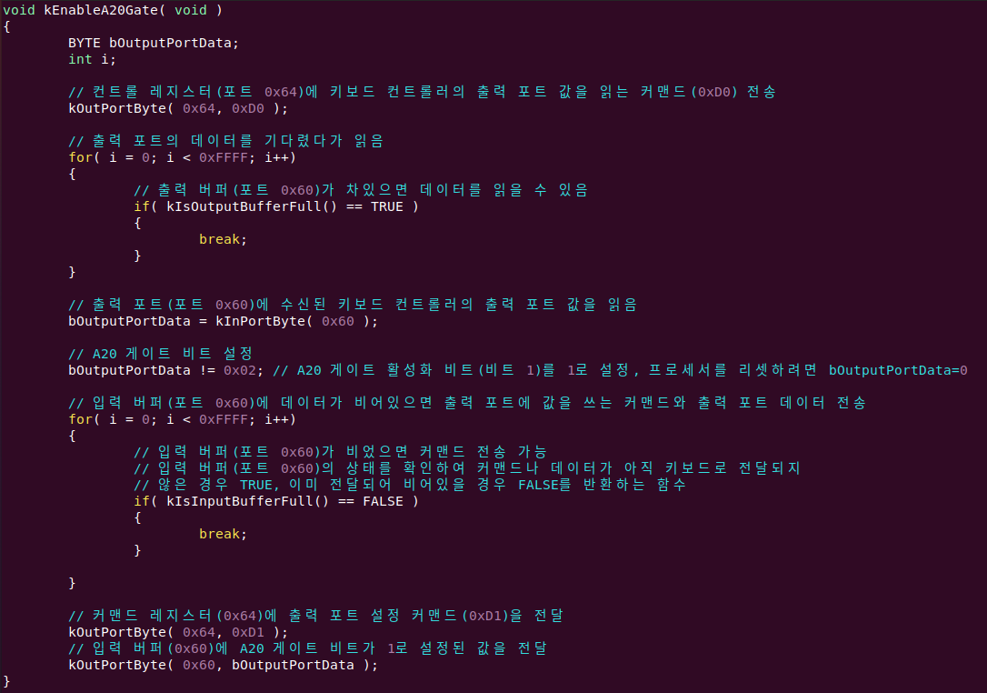 그리고 그 값을 다시 0xD1 커맨드 키보드 컨트롤러의 출력 포트에 보내어 A20 게이트를 활성화했습니다.
