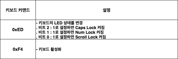 키보드는 커맨드 또는 데이터를 수신할 때마다 키보드 컨트롤러로 응답 코드를 전송하므로 키보드로 커맨드나 데이터를 전송하고 나서 처리 상태를 확인해야 합니다.