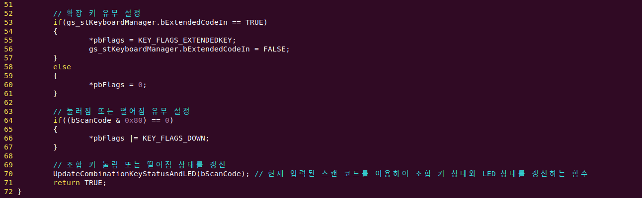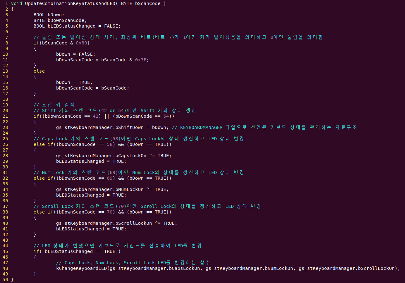 조합 키이면 키보드 상태를 관리하는 자료구조에 정보를 갱신하고 LED 상태 변경이 필요하다면 이전에 작성한 kChangeKeyboardLED() 함수를 호출하도록 작성되었습니다.