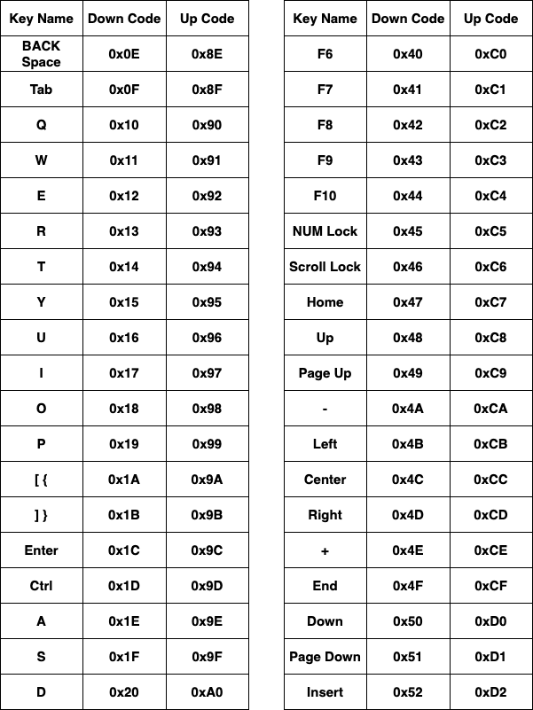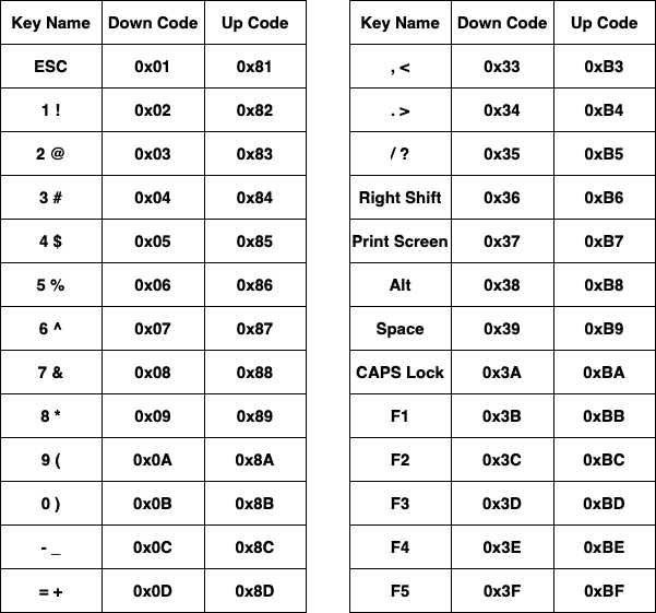키보드의 모든 키는 각자의 고유 코드를 가지고 있으며, 키보드는 키가 눌리거나 떨어질 때마다 그 상태에 해당하는 키 값을 키보드 컨트롤러로 전송하는데, 스캔 코드는 키가 눌렸을 때(Down)와 떨어졌을 때(Up)의 값이 다르며 일반적으로 떨어졌을 때의 키 값은 눌려졌을 때의 값에 최상위 비트(bit 7)를 1로 설정한 값과 같습니다.