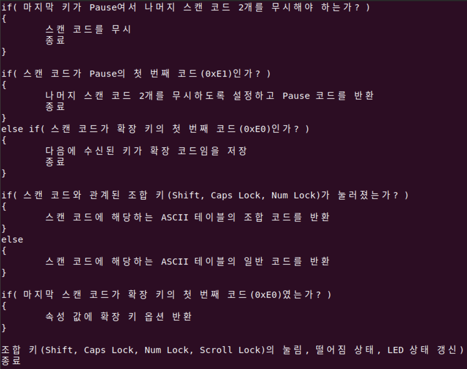 지금까지 키 값 변환에 필요한 자료구조와 테이블을 알아보았으므로 본격적으로 스캔 코드를 ASCII 코드로 변환합니다.