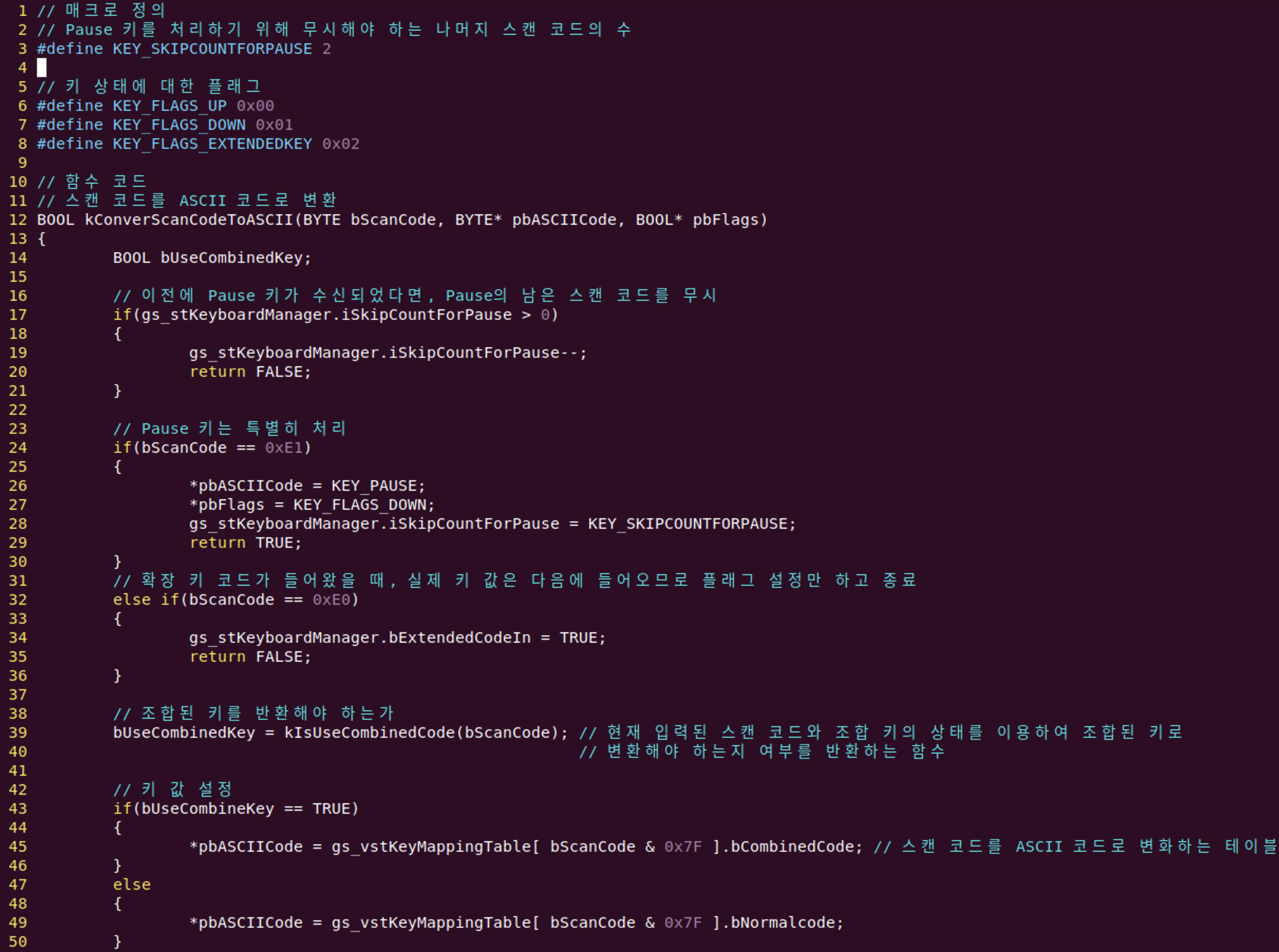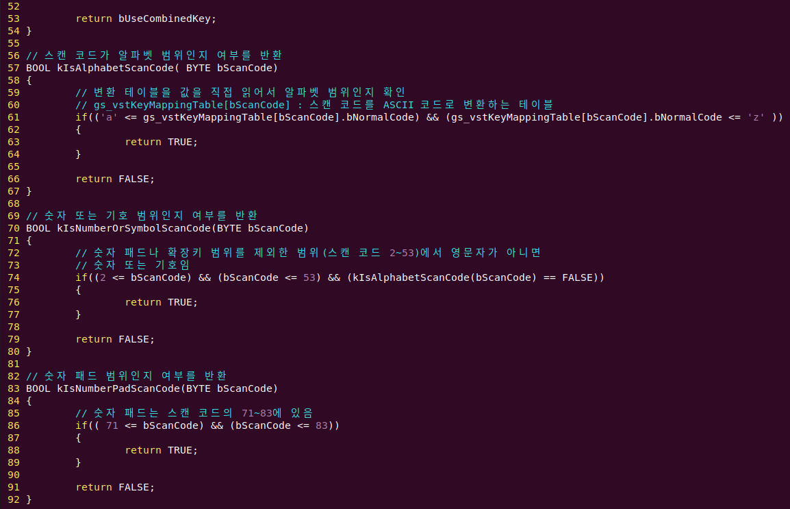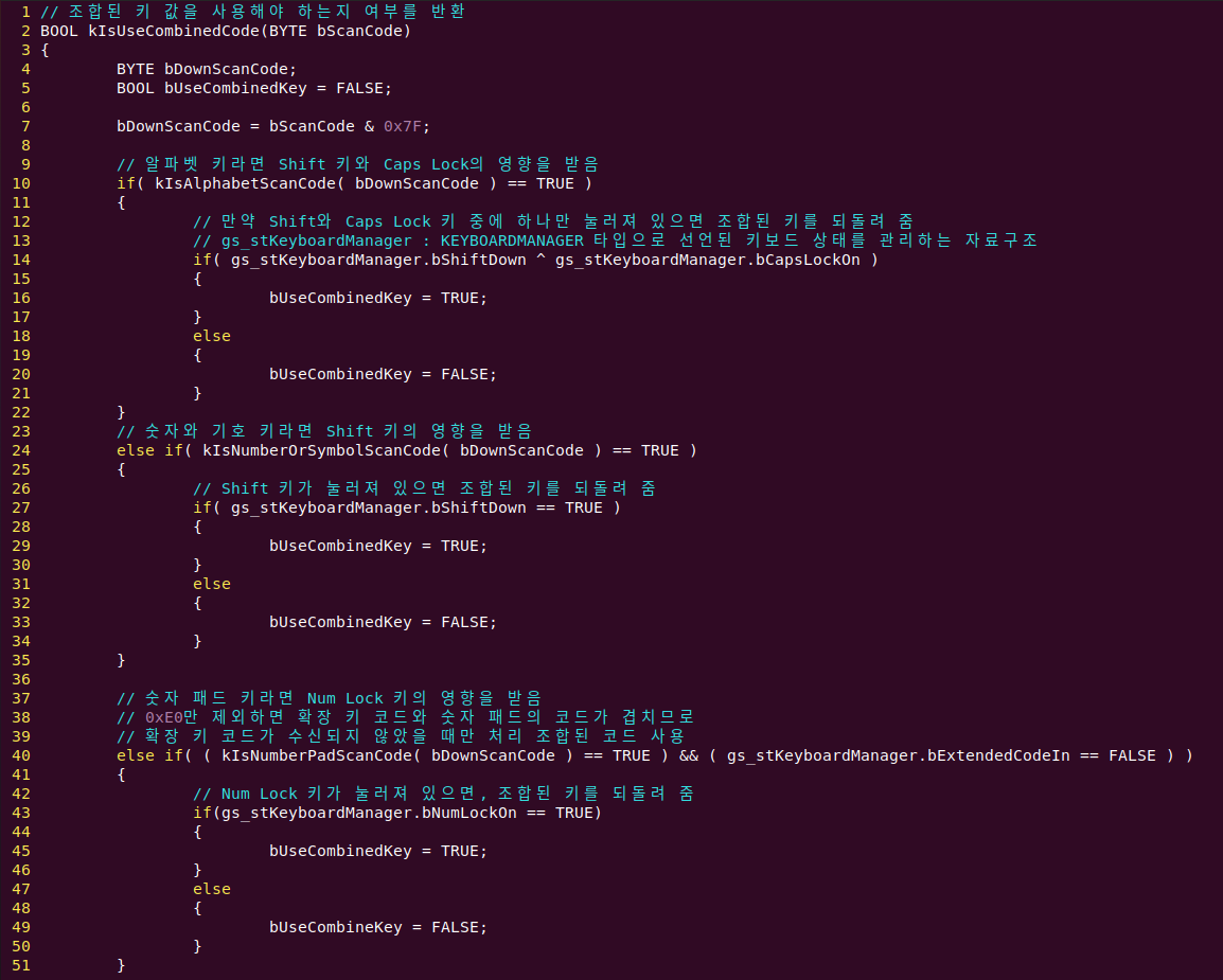 키 값을 ASCII 문자로 변환하려면 스캔 코드를 ASCII 코드로 매핑할 때 일반 키를 반환할지 혹은 조합 키를 반환할지를 판단해야 하기 때문에 Shift 키와 Caps Lock 키, Num Lock 키, 즉 조합 키의 상태를 알고 있어야 합니다.