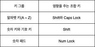 위의 키 그룹과 관련된 조합 키 그림과 같이 키 그룹을 알파벳 키, 숫자와 기호 키, 숫자 패드로 나누어 처리합니다.