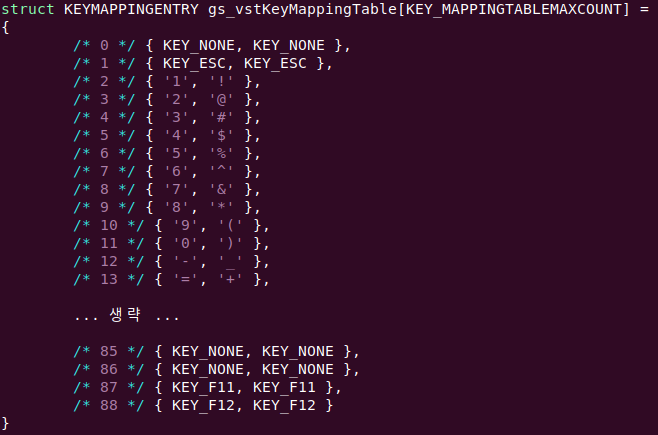 확장 키를 제외한 스캔 코드의 수는 0x58, 즉 88개이므로 스캔 코드의 값을 테이블 인덱스로 사용하여 ASCII 값을 구하는 변환 테이블을 만들어 사용합니다.