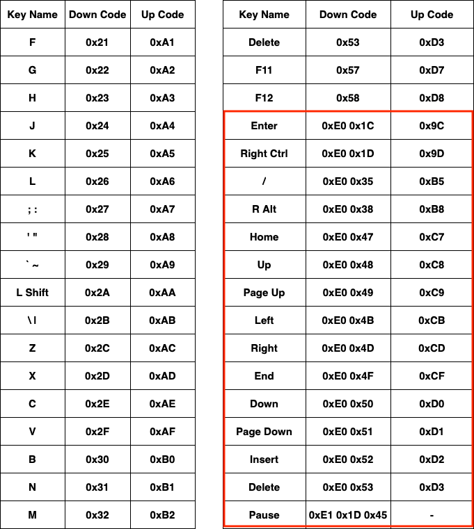 위의 표에서 빨간색 박스로 된 부분은 확장키(Extended Key)의 스캔 코드를 표시한 것입니다.