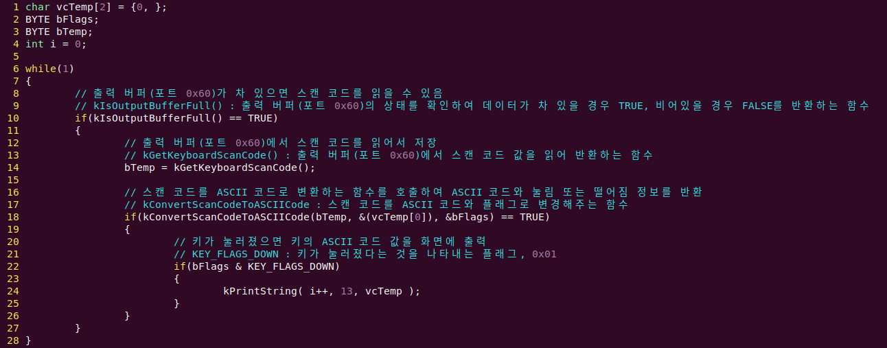 지금은 키보드 디바이스 드라이버를 테스트하는 것이 주목적이므로 입력된 스캔 코드를 변환하여 화면에 순차적으로 출력하는 기능만 구현합니다.