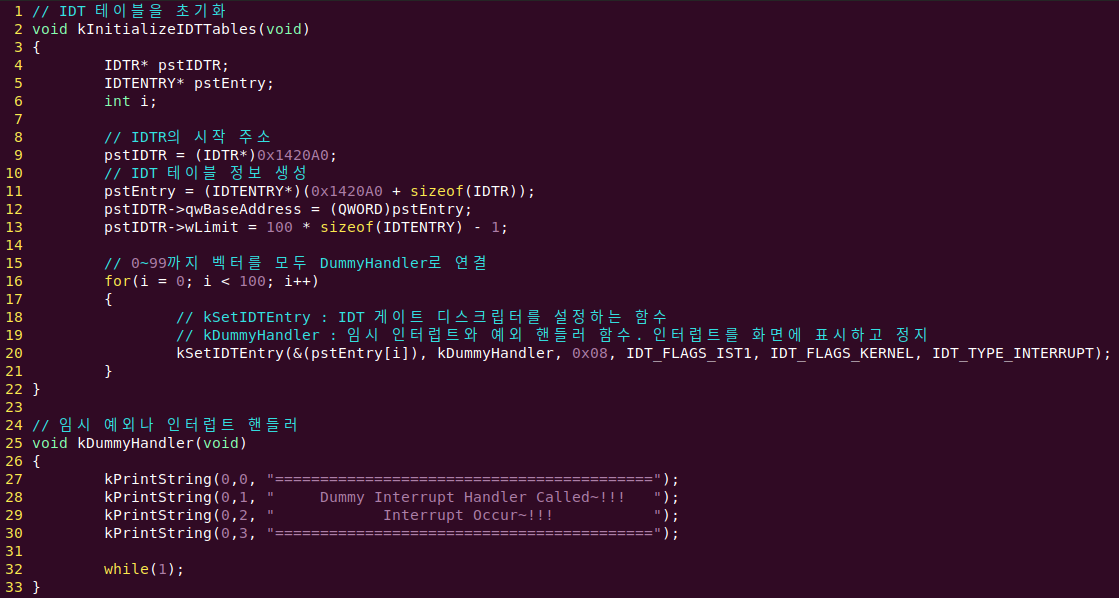 그리고 임시 인터럽트 핸들러인 kDummyHandler() 함수는 테스트를 위해 화면에 메시지를 출력하고 정지하게 해서 인터럽트 또는 예외 발생 시 쉽게 확인할 수 있도록 합니다.