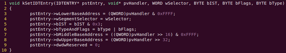 kSetIDTEntry() 함수는 파라미터로 넘겨진 값을 자료구조로 채워주는 역할만 합니다.