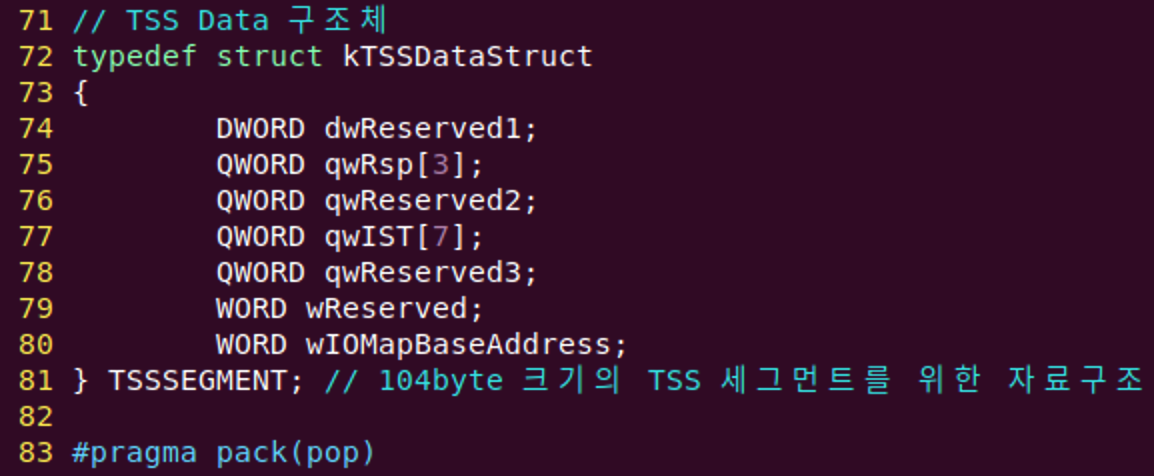 GDTENTRY8, GETENTRY16 자료구조의 필드는 이전의 IA-32e 모드의 TSS 디스크립터 그림을 그대로 옮긴 것이고, TSSSEEGMENT 자료구조는 IA-32e 모드의 TSS 세그먼트 구조의 내용을 참고하면 됩니다.