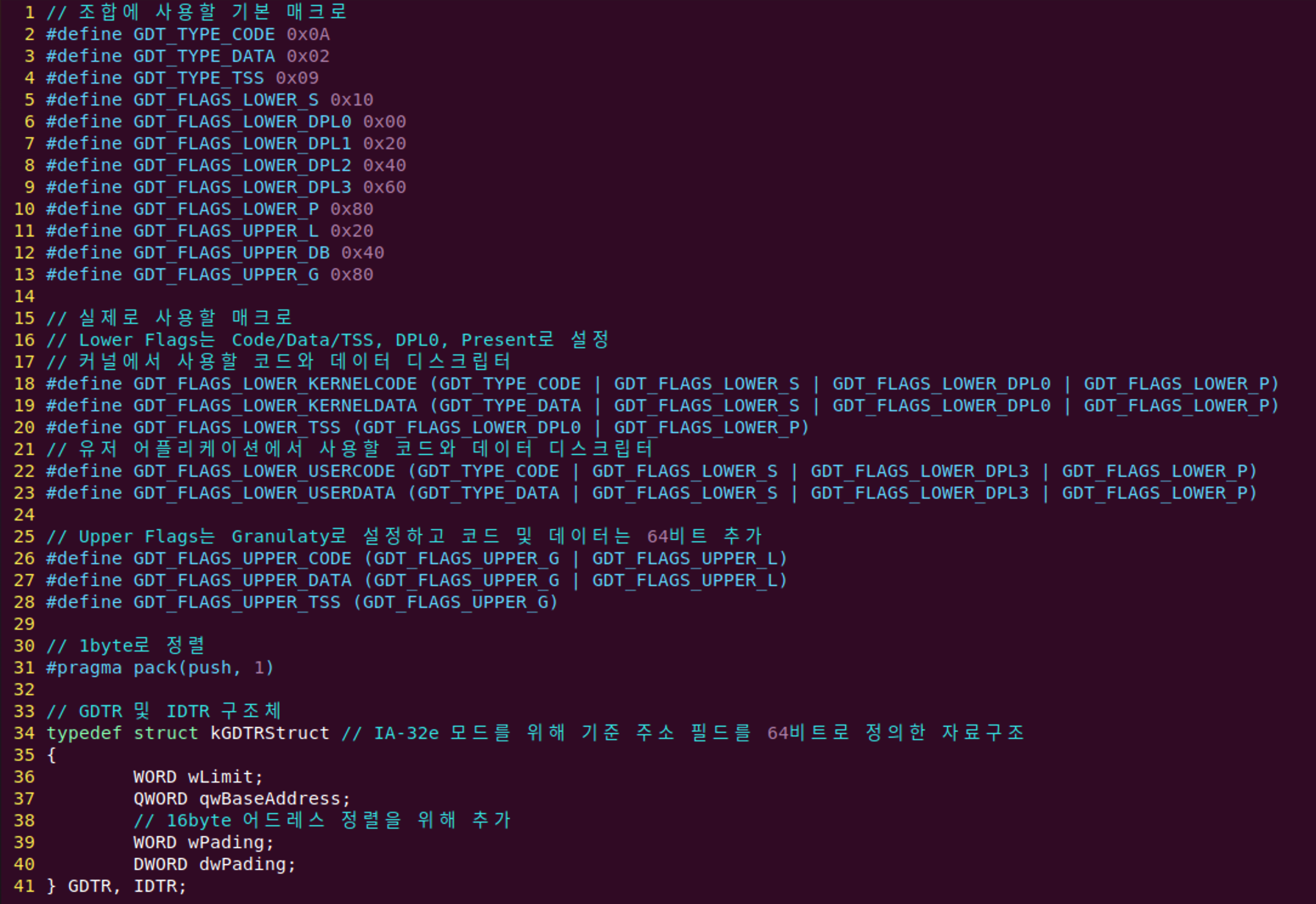 GDT는 GDT 테이블과 GDT에 대한 정보를 나타내는 자료구조로 구성되어 있기 때문에 이 두 가지 자료구조를 정의하고 각 자료구조에 맞는 매크로도 함께 정의합니다.