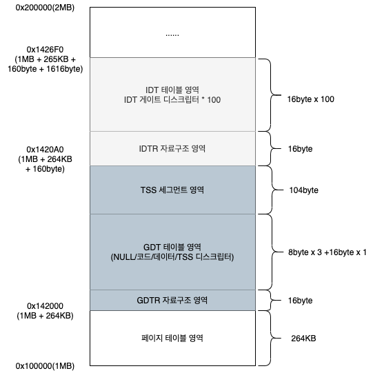 위 코드에서 GDTR 자료구조의 시작 주소를 0x142000으로 설정하고, 그 이후 주소부터 각 자료구조를 위치시킨 이유는 0x100000(1MB) 영역부터 264KB를 페이지 테이블로 사용하기 때문입니다.