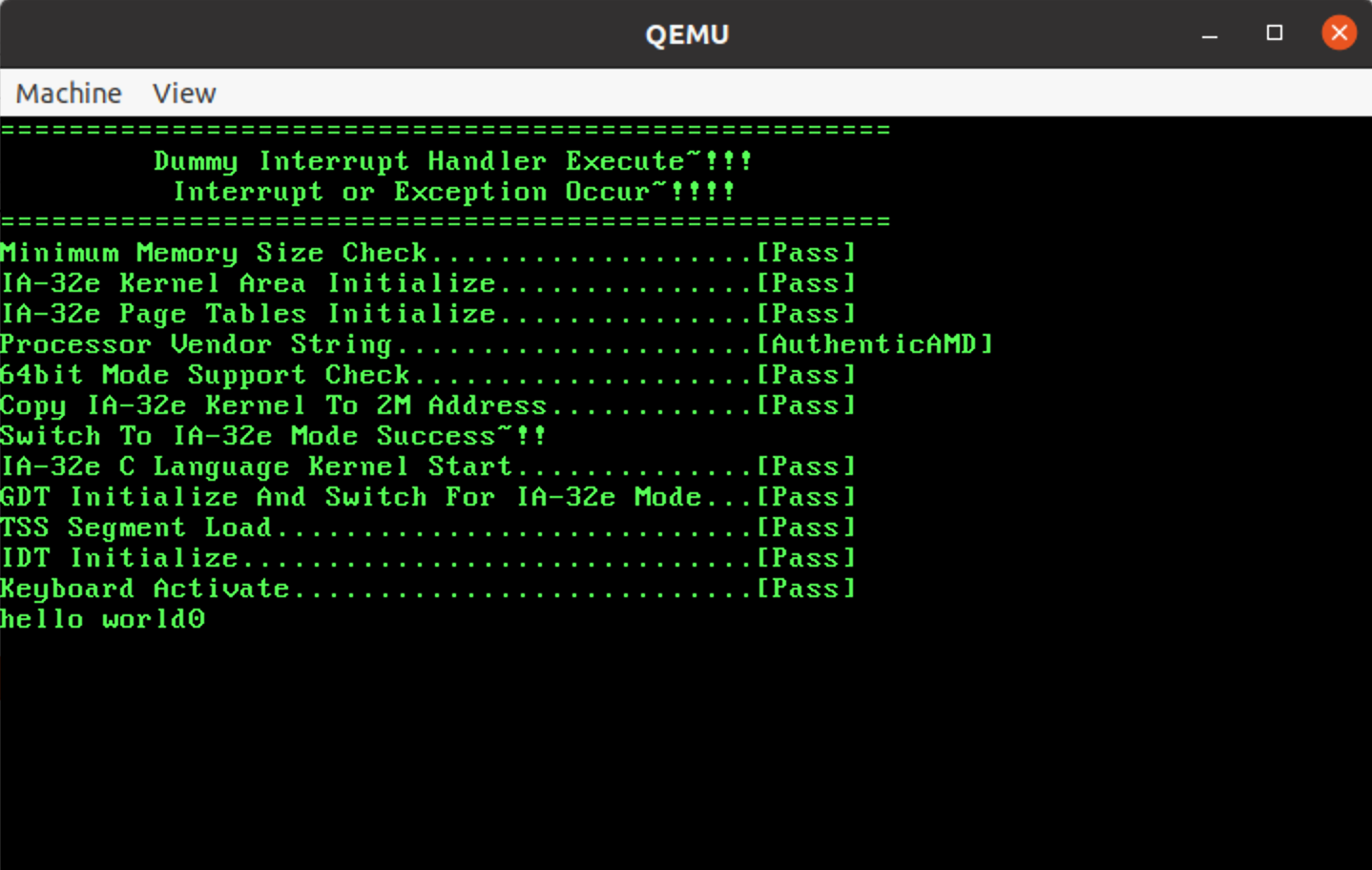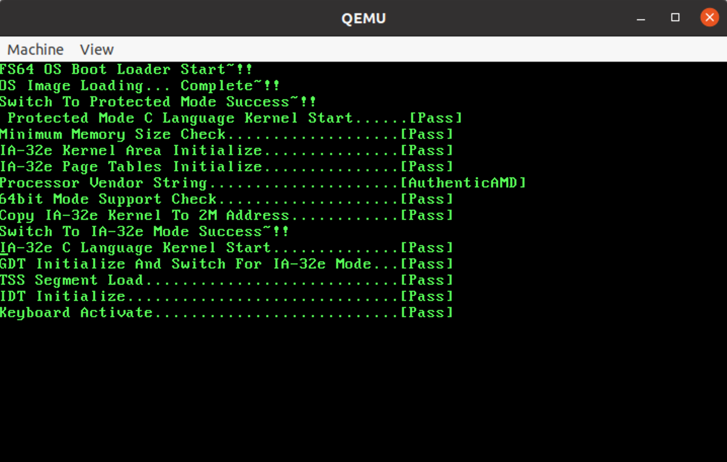 이제 FS64 OS에 GDT, IDT, TSS에 대한 모든 내용이 적용되었으므로 빌드한 후 실행합니다.