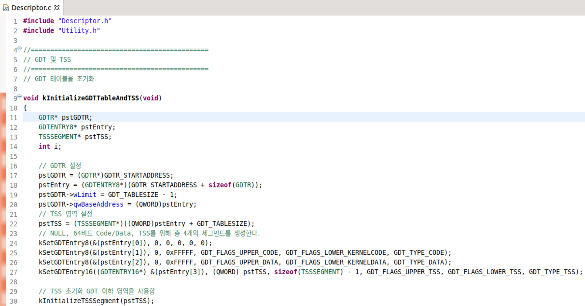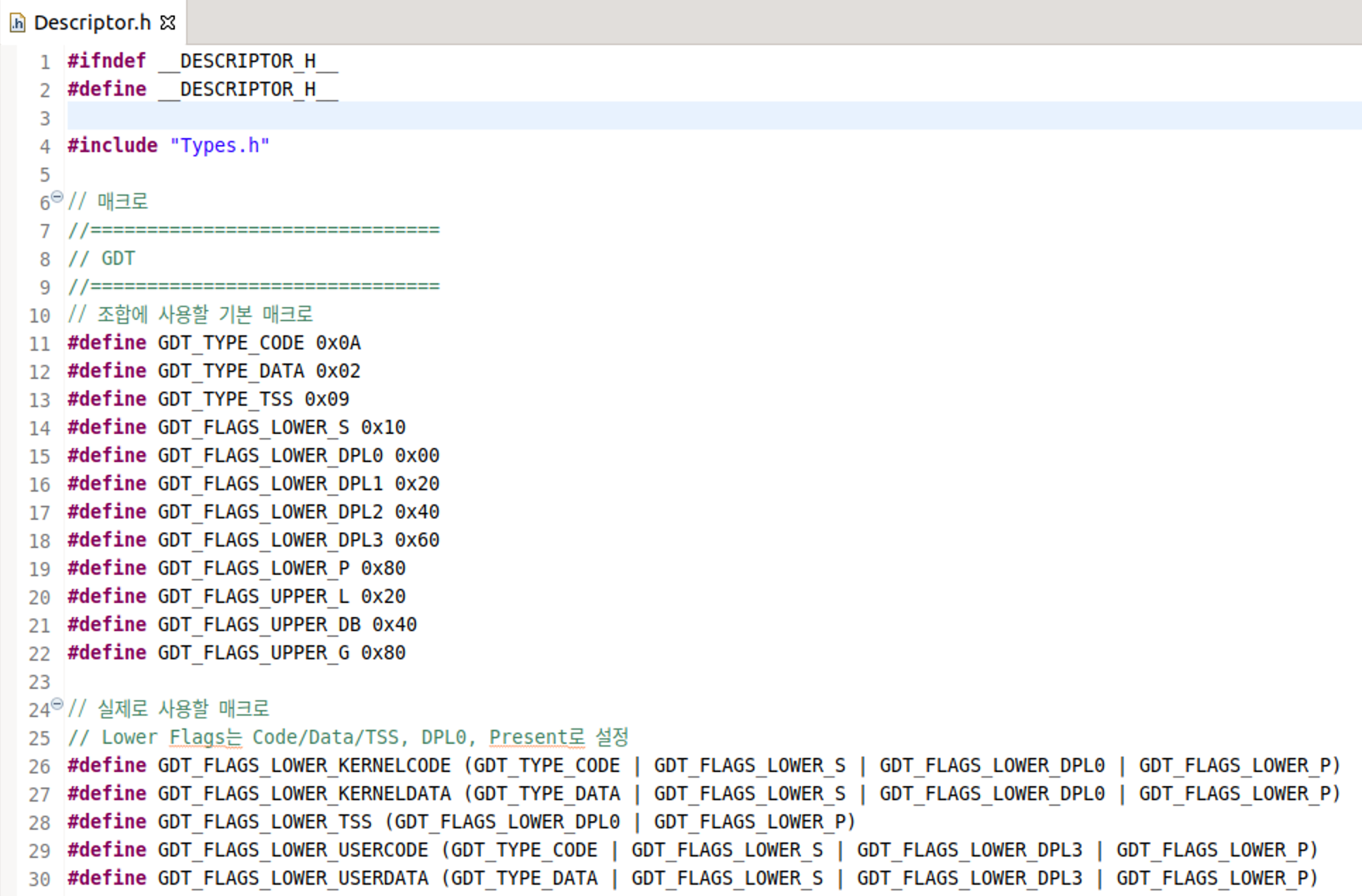 디스크립터 파일은 현재 가장 핵심적인 역할을 하는 파일로, GDT와 IDT에 관련된 모든 함수와 매크로가 정의되어 있습니다.
