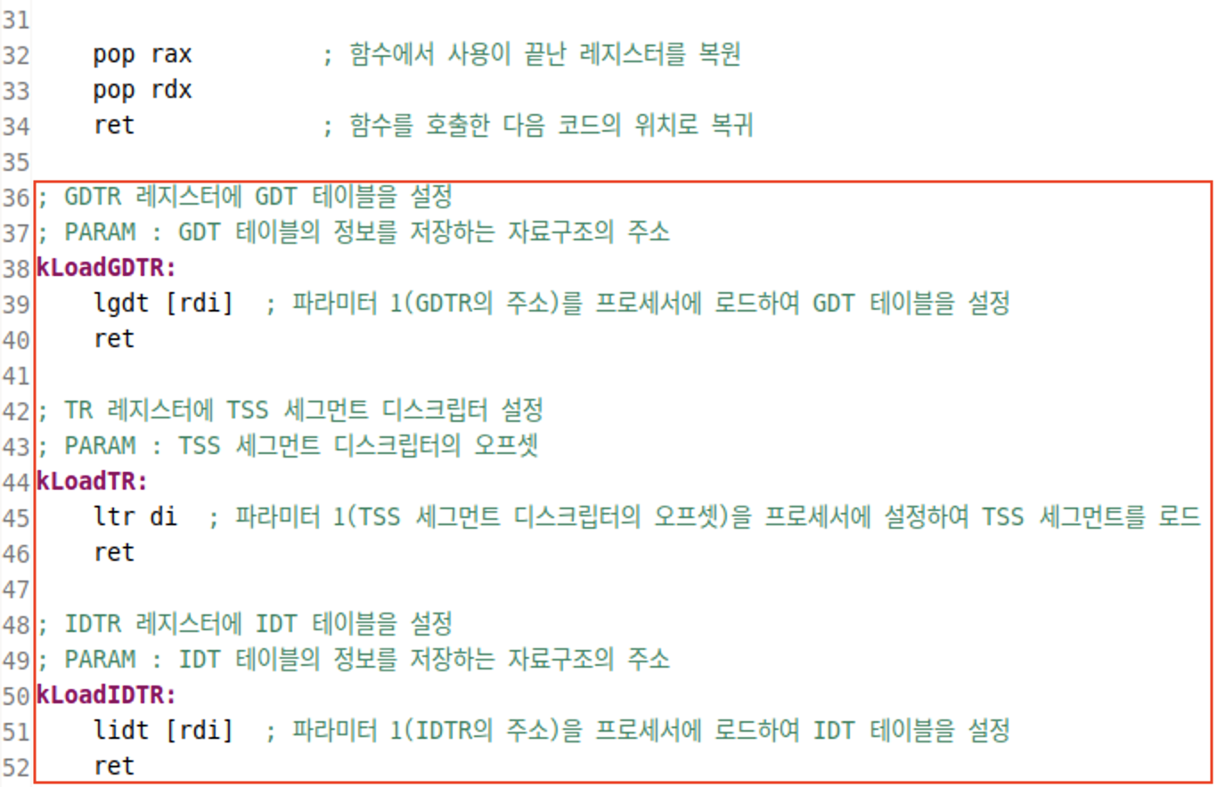 어셈블리어 함수 kLoadGDTR(), kLoadTR(), kLoadIDTR()를 추가했으므로 이를 어셈블리어 유틸리티 파일에 반영합니다.