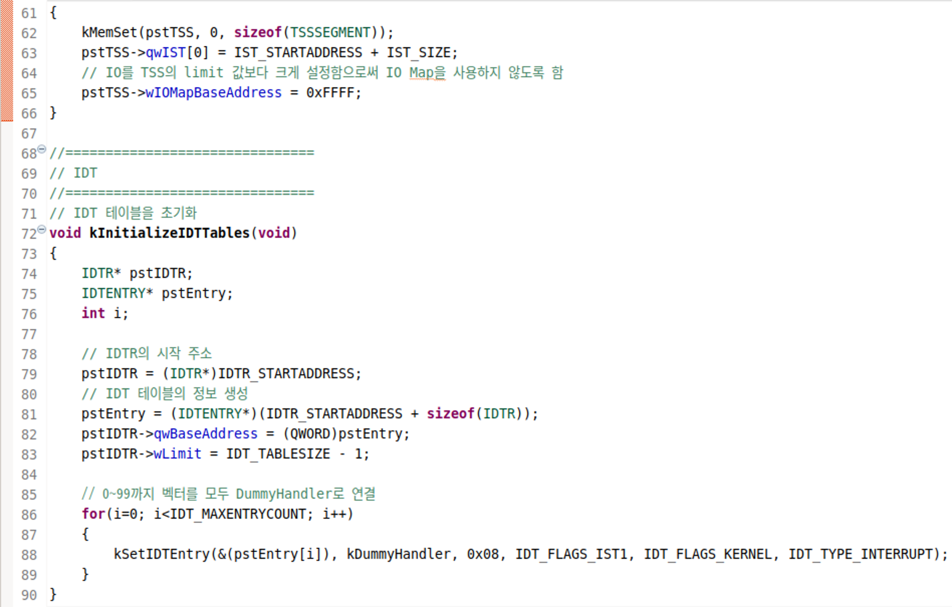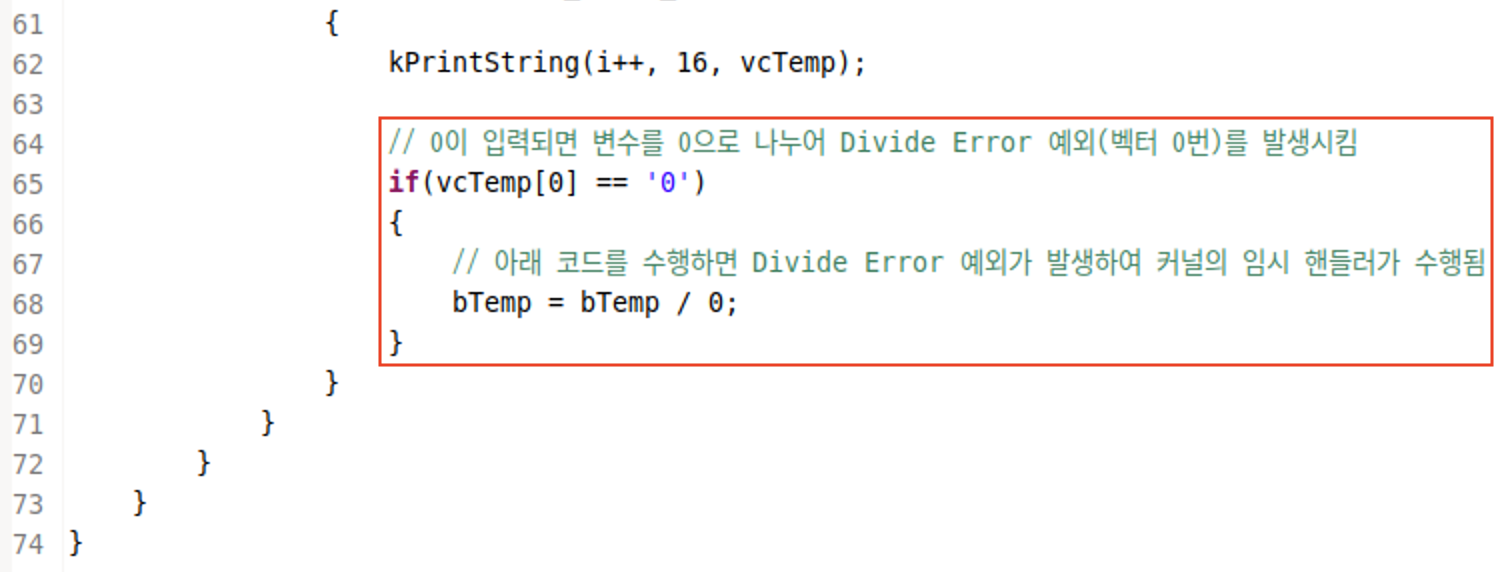이러한 특징을 이용하여 키를 입력받는 while() 루프 안에 숫자 0 키가 입력되면 임시 변수를 0으로 나누어 예외가 발생하도록 하였으며, 만약 IDT 테이블이 정상적으로 생성되고 프로세서에 로드 되었다면, 임시 핸들러(kDummyHandler() 함수)가 호출되고 커널이 정지할 것입니다.