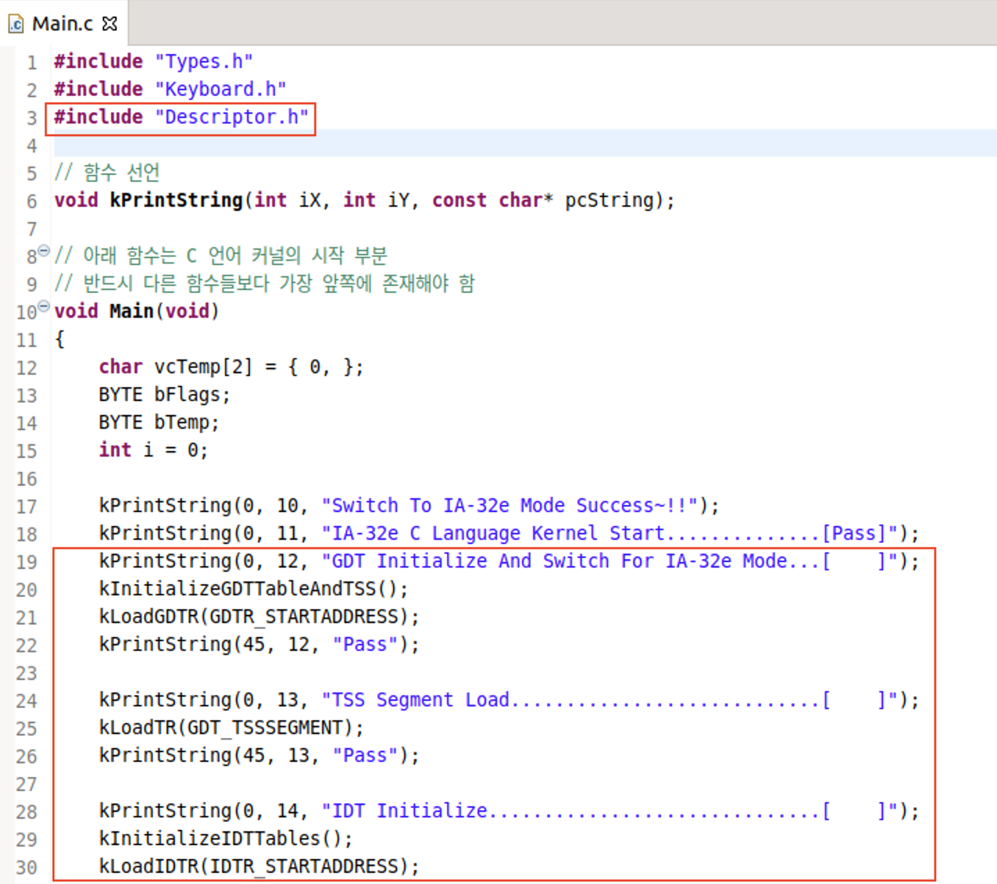 C 언어 커널 엔트리 포인트는 이전의 코드와 대부분이 같으므로 수정된 부분 위주로 나타냈습니다.