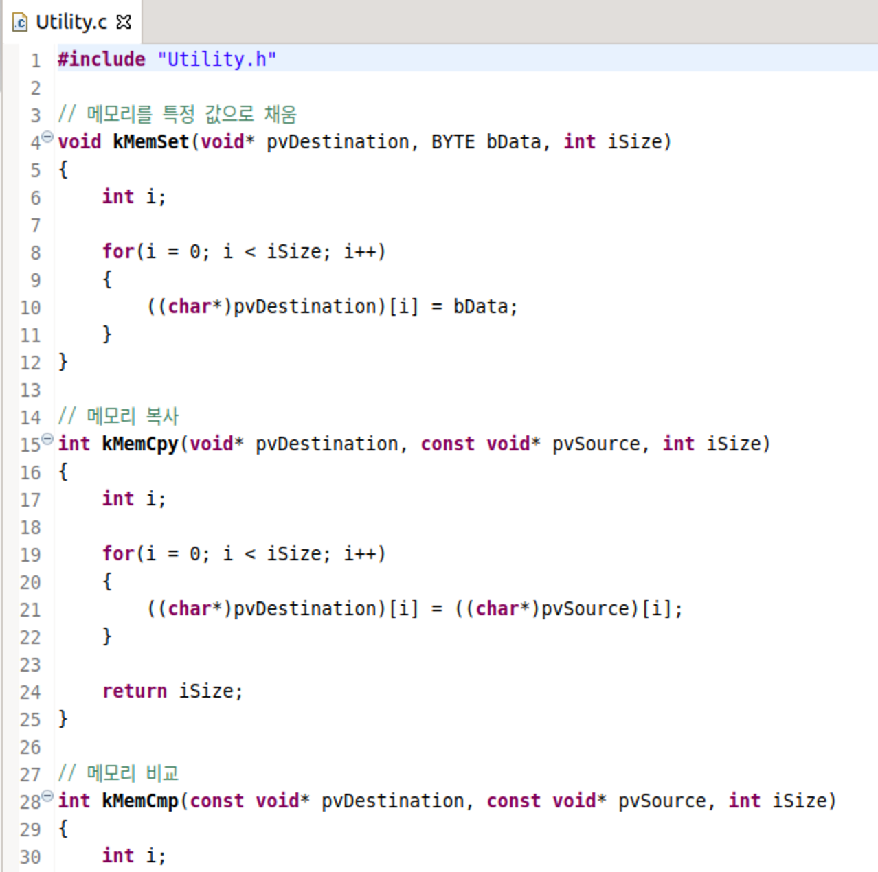 아래의 코드는 유틸리티 파일의 내용이고, kMemSet(), kMemCpy(), kMemCmp() 함수가 포함되어 있습니다.