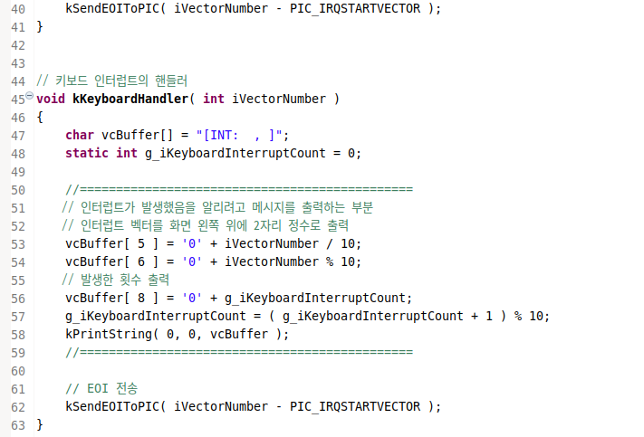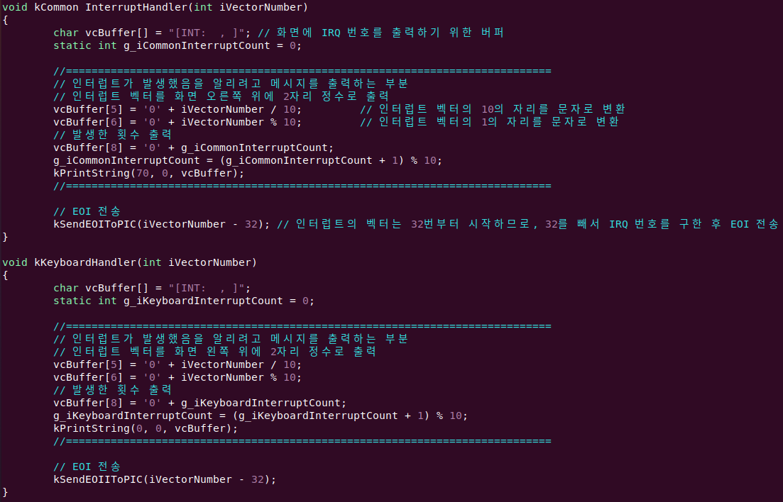 파라미터로 넘겨받은 벡터 번호를 이용하여 PIC 컨트롤러에 EOI를 전송하고, 화면의 왼쪽과 오른쪽 위에 벡터 번호와 발생한 횟수를 출력합니다.