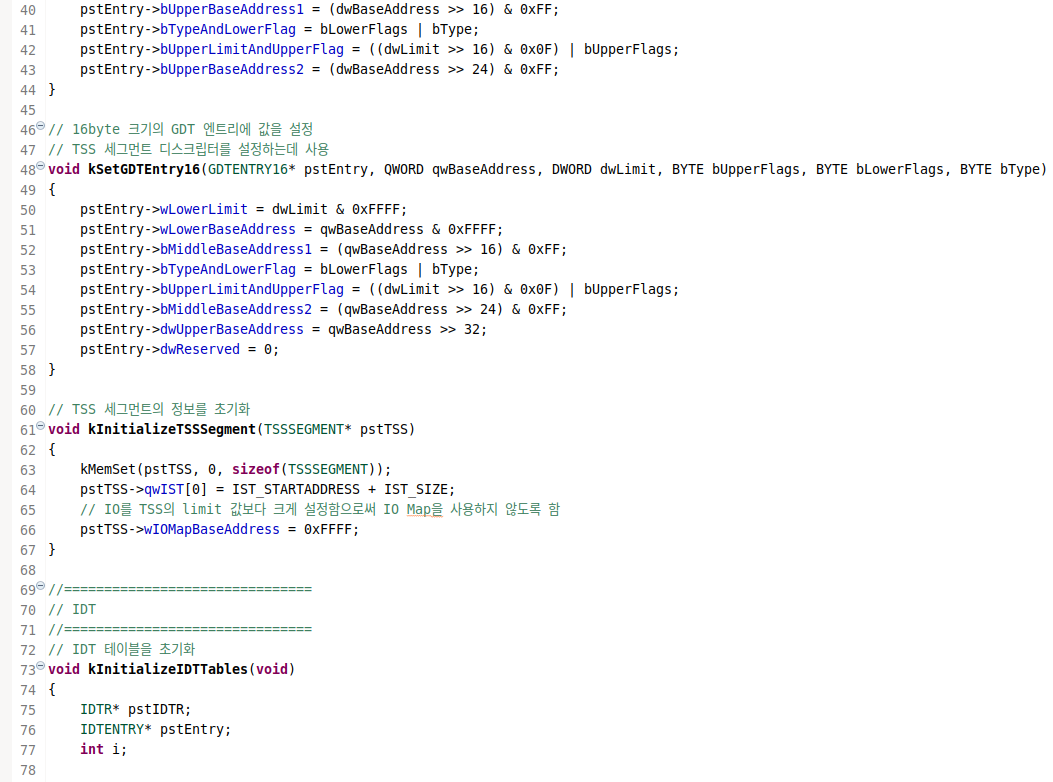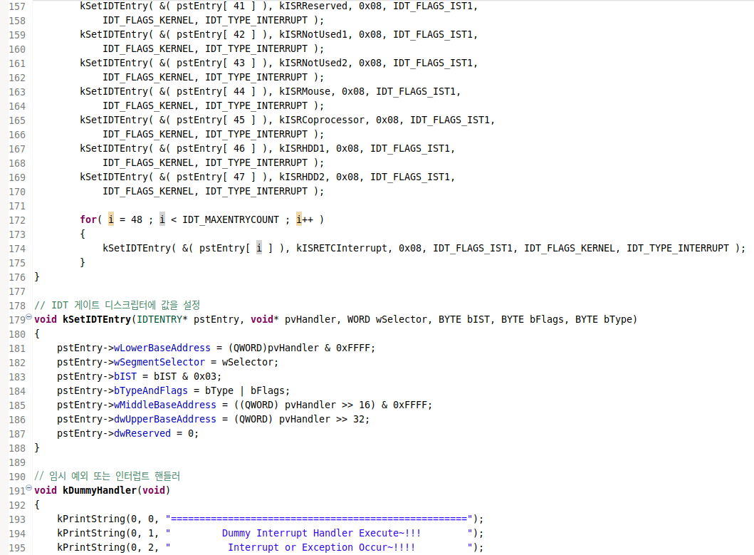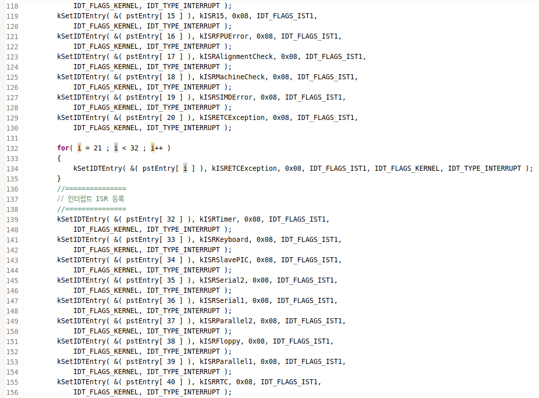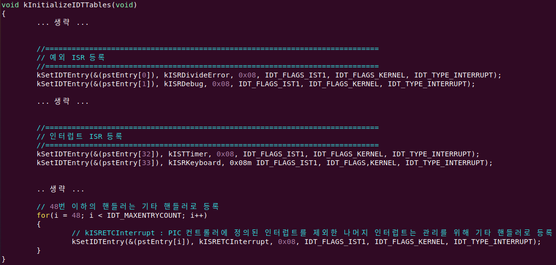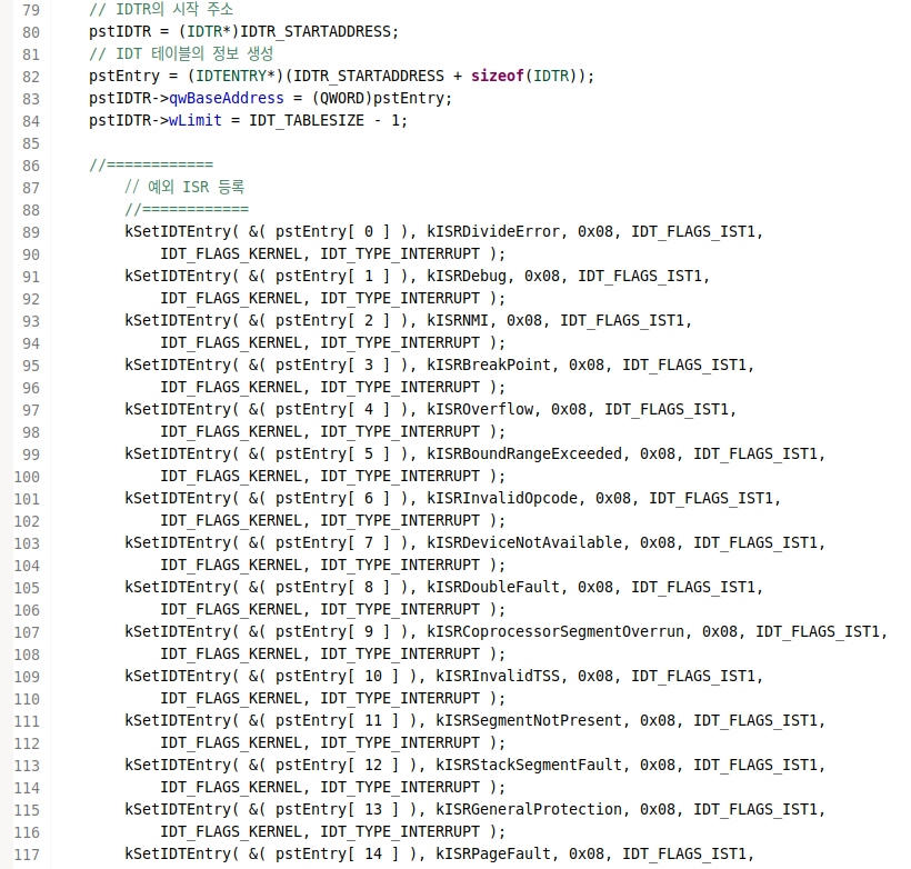 바뀐 부분은 kInitializeIDTTables() 함수이므로 이 함수를 제외한 나머지 부분은 기존 코드와 같습니다.
