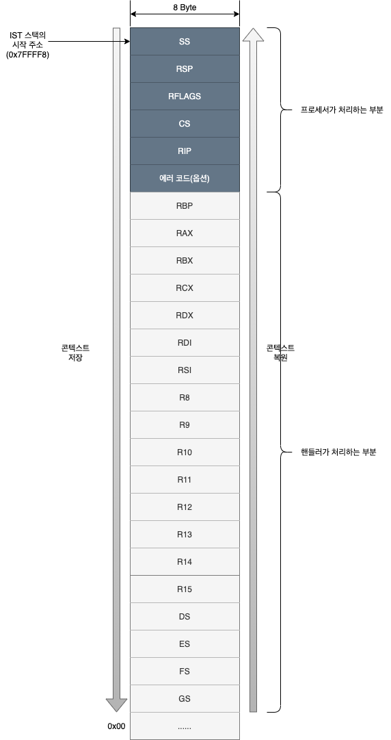 위의 그림과 코드를 보면, 인터럽트나 예외가 발생했을 때 프로세서가 하는 역할은 단순히 IST 스택에 콘텍스트의 일부를 저장하고 복원하는 것뿐입니다.