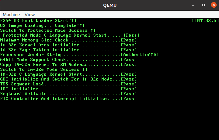 소스 코드를 빌드한 후, 생성된 Disk.img 파일을 QEMU나 PC에서 실행하면 아래의 사진과 같은 화면이 표시됩니다.
