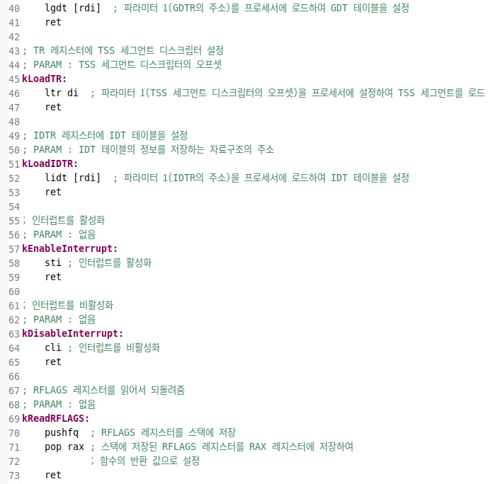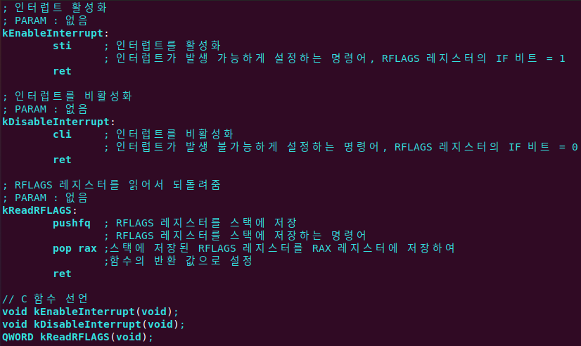 아래의 코드는 인터럽트를 화성화 또는 비활성화하는 어셈블리어 함수와 RFLAGS 레지스터의 값을 읽는 어셈블리어 함수, 함수 선언입니다.