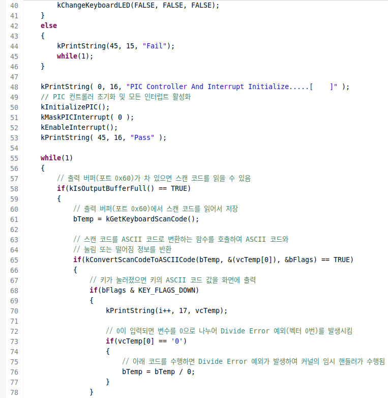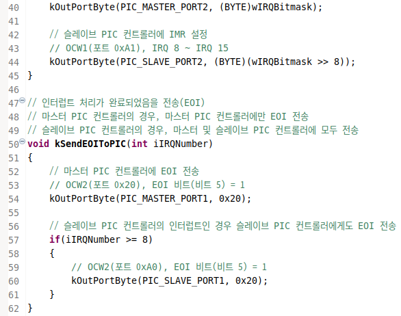 main() 함수 뒷부분에 PIC를 초기화하는 kInitializePIC() 함수를 호출한 뒤, PIC 컨트롤러에 연결된 모든 디바이스에 대해서 인터럽트가 발생할 수 있게 kMaskPICInterrupt() 함수를 호출하고, 마지막으로 kEnableInterrupt() 함수를 호출하여 프로세서가 인터럽트를 처리하게 합니다.
