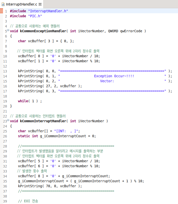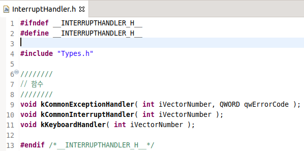 인터럽트 핸들러 파일은 02.Kernel64/Source 디렉터리에 있으면 파일 내용은 아래와 같습니다.