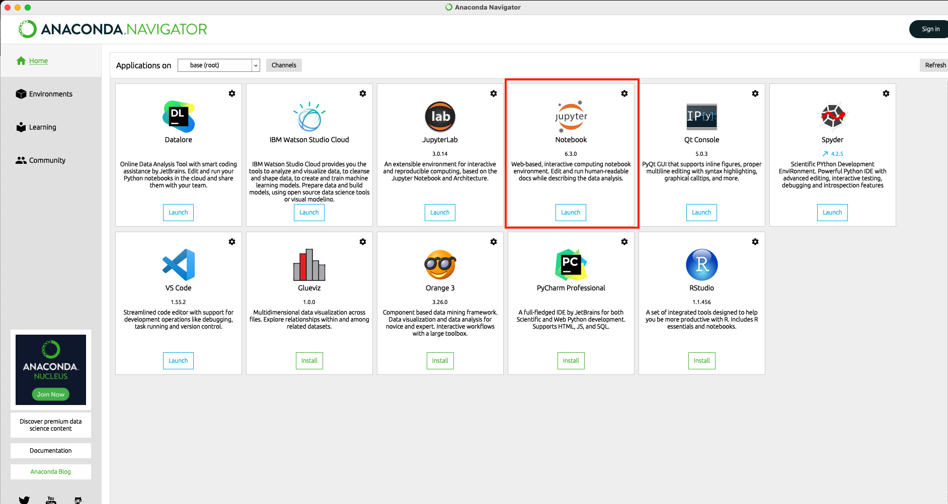 사진에서와 같이 notebook 부분에 있는 Launch를 클릭하면 터미널이 뜬 뒤 Jupyter notebook이 실행될 것입니다.