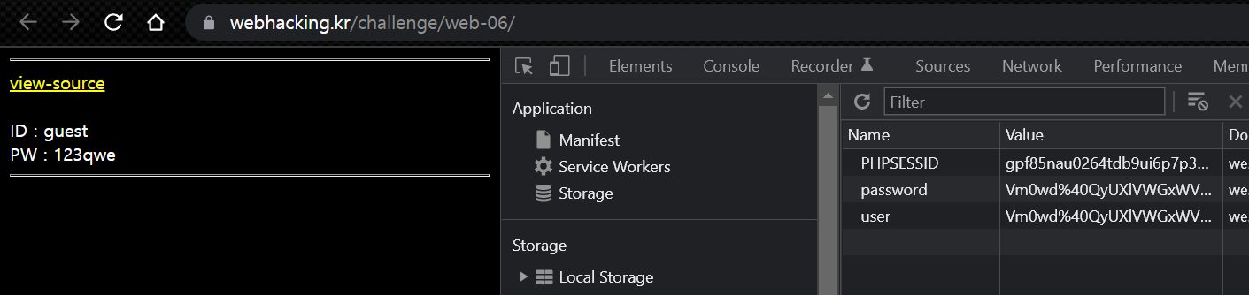 위의 스크립트를 실행하면 admin과 nimda에 대한 base64 인코딩 값이 나오고 문제 페이지에서 F12 개발자 도구를 이용해 user와 password 쿠키 값을 설정한 뒤 새로고침 하면 풀린다.