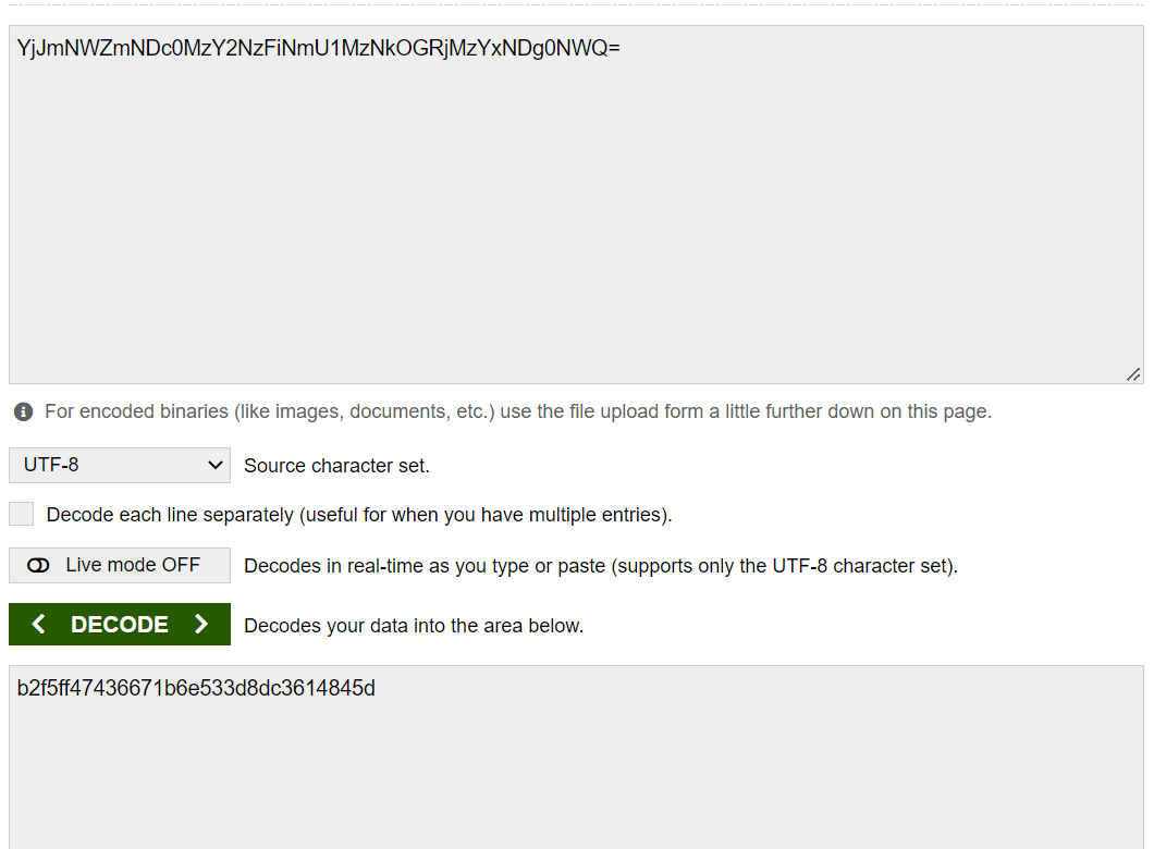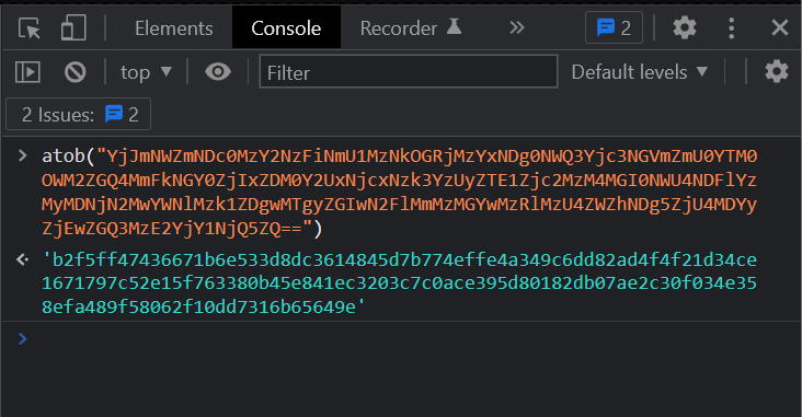 해당 값을 atob()로 base64 디코딩하면 MD5 암호 해시 값이 나오고, 해당 값을 32글자씩 나누면 단일 문자의 MD5 값이 된다.