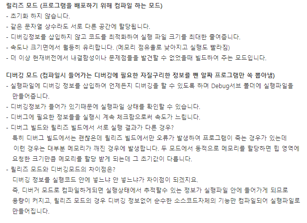 위의 사진의 내용은 Debug모드와 Release모드의 차이점을 설명해주고 있다.